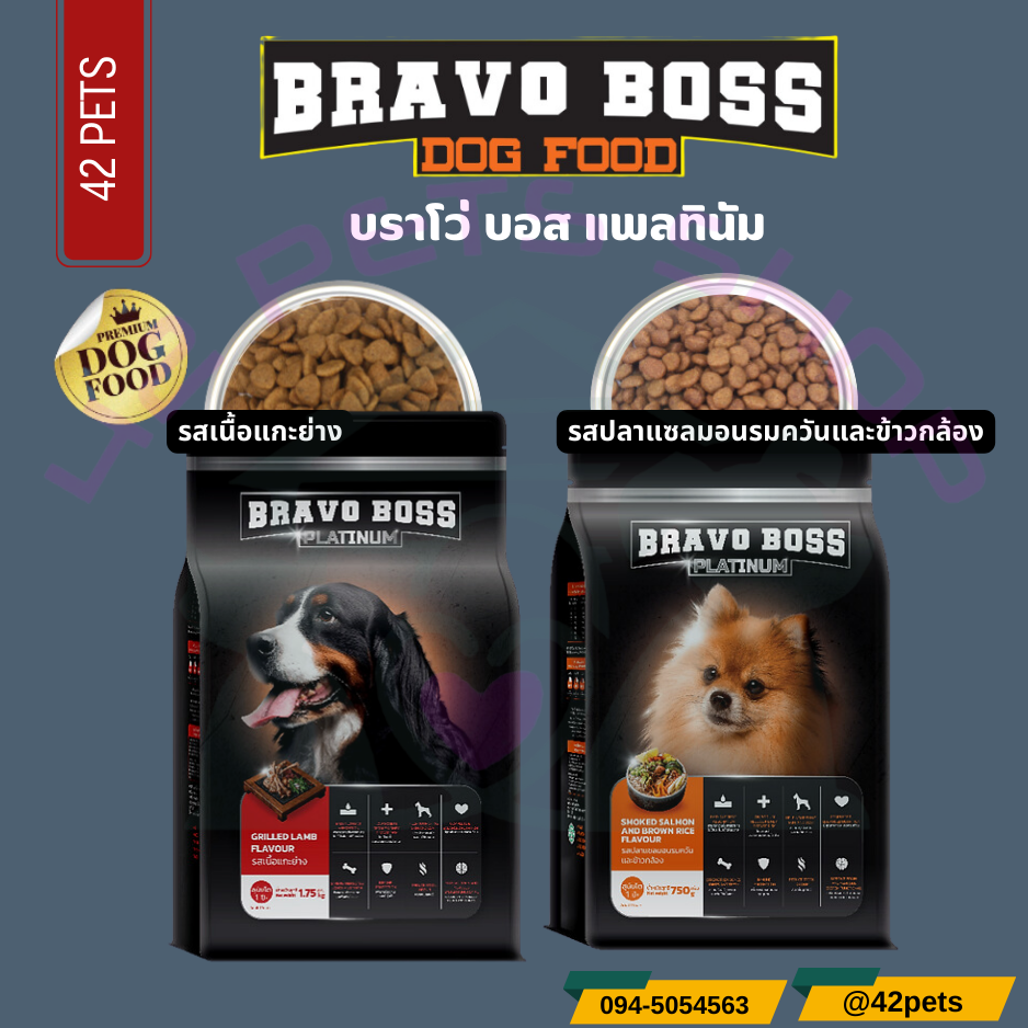 อาหารสุนัข บราโว่บอส แพลตินัม Bravo Boss Platinum ขนาด 750 กรัม​ รสเนื้อแกะย่าง และ รสปลาแซลมอนรมควันและข้าวกล้อง​