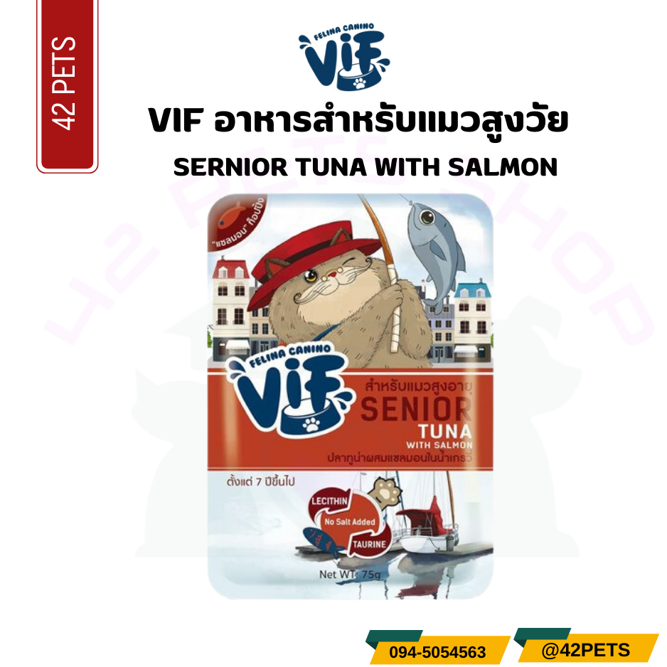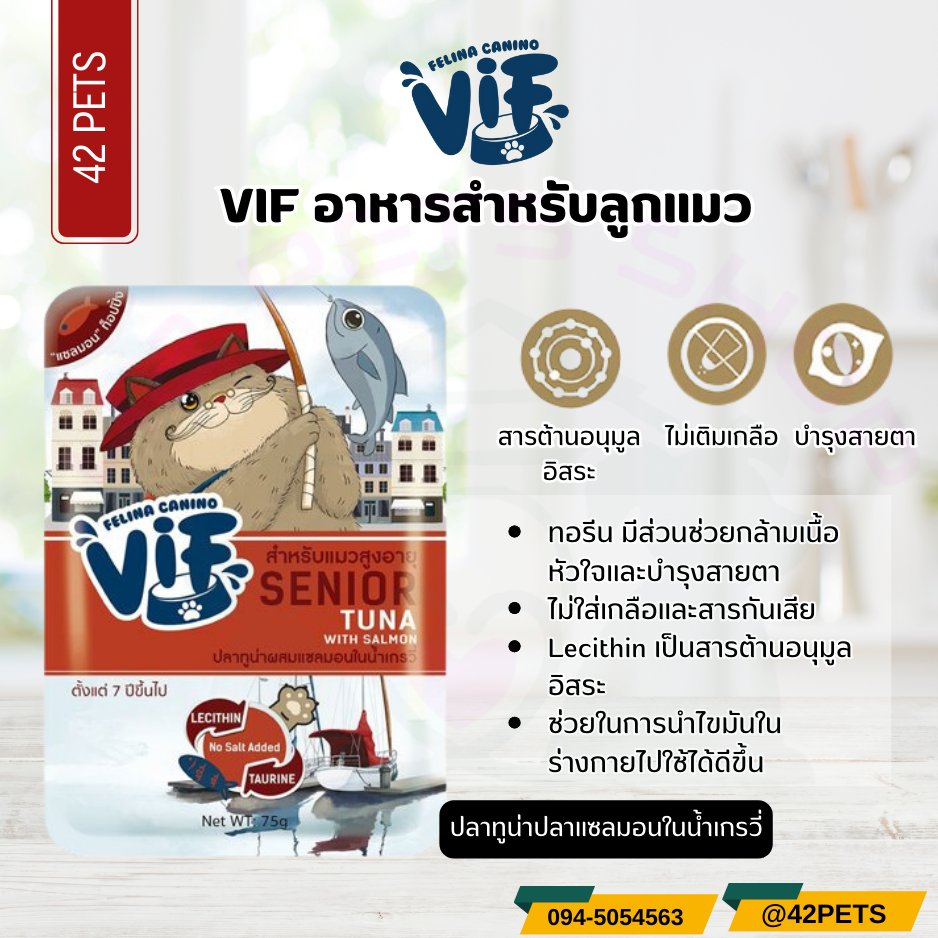 Felina Canino Vif Senior Tuna with Salmon in Gravy เฟลิน่า วิฟ ปลาทูน่าผสมแซลมอนในน้ำเกรวี่ สูตรแมวสูงวัย 75g. SC3