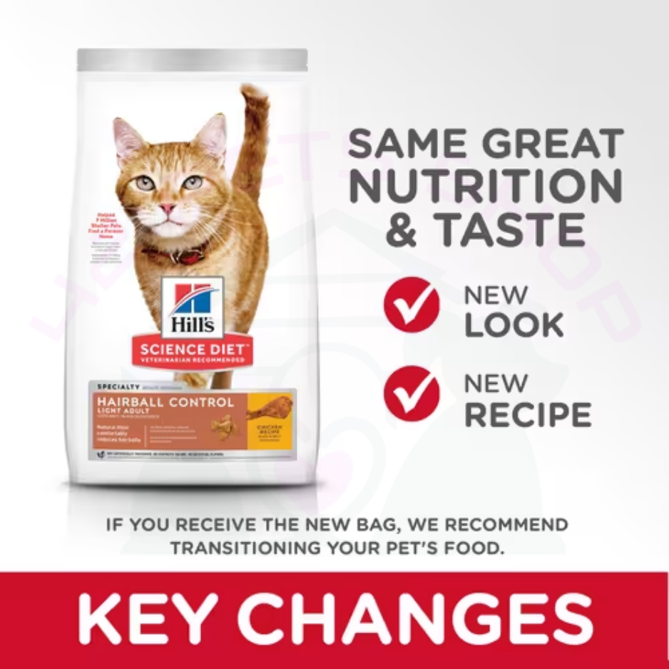 Hill’s® Science Diet® Hairball Control Light Adult อาหารแมวสูตรควบคุมปัญหาก้อนขนและมีพลังงานต่ำสำหรับแมว อายุ 1-6 ปี มีสารอาหารที่ช่วยลดการก่อตัวของก้อนขนในแมว และควบคุมน้ำหนักแมวให้มีสุขภาพดี