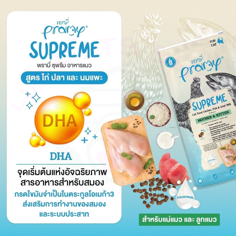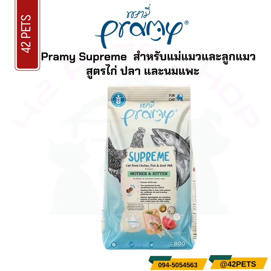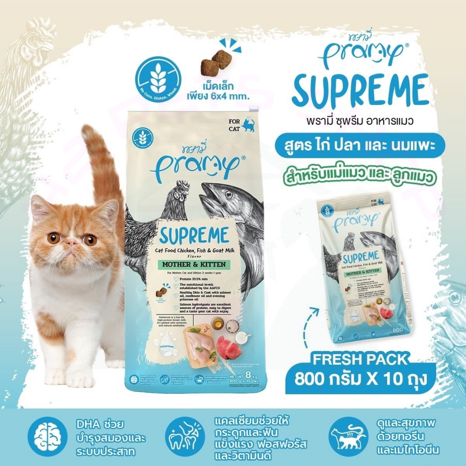 Pramy Supreme Cat food Chicken Fish & Goat Milk สูตรไก่และปลาทูน่านมแพะ สำหรับแม่และลูกแมว 800g.*10ถุง